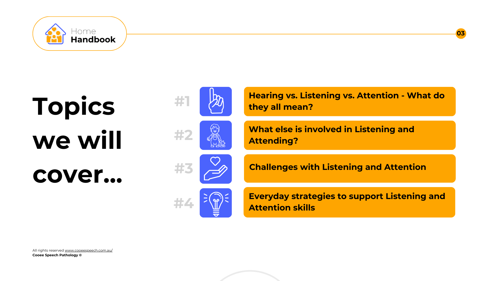 Learn about key skills that support listening and attending, and learn about useful home tips!